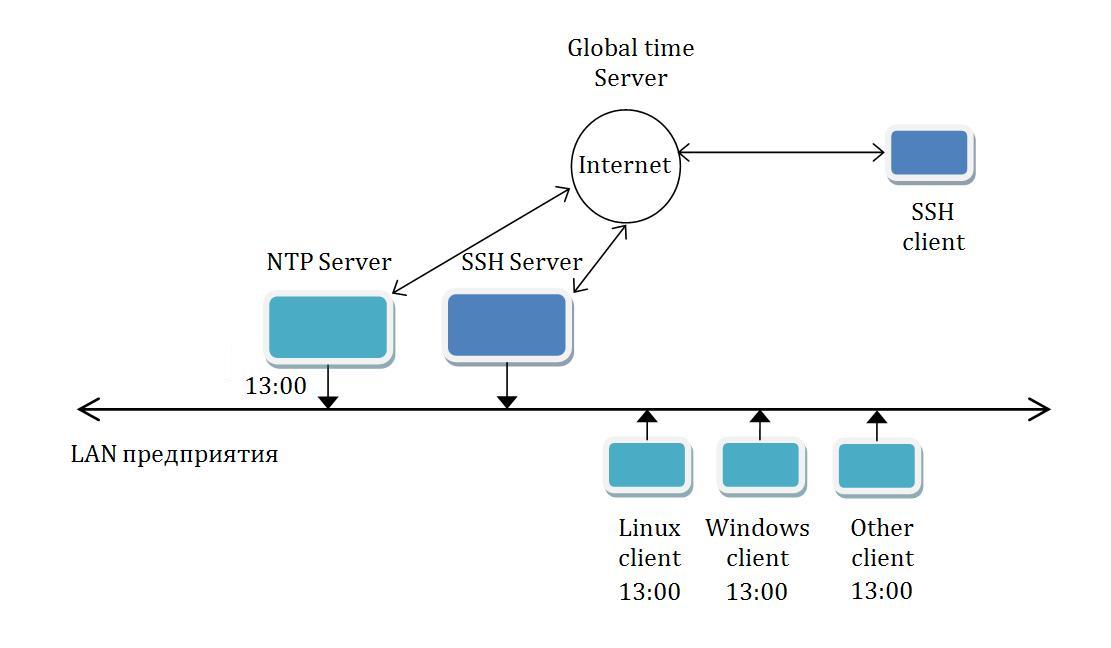 NTP - сервис который синхронизирует настройки времени в корпоративной сети предприятия.